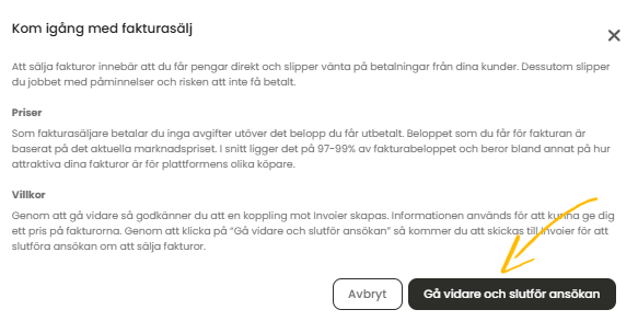 3. När du klickat på ”Kom igång med fakturasälj” dyker en ruta upp med priser och villkor. Klicka på "Gå vidare och slutför ansökan" för att signera avtalet och slutföra onboardingen hos Invoier.