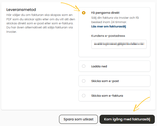 3. Välj leveranssätt "Få pengarna direkt" och se till att det finns en e-postadress angiven på kunden.