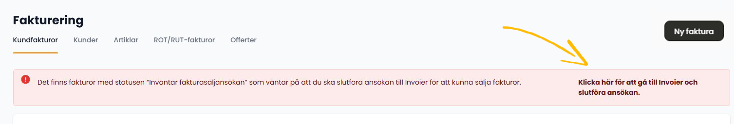 Inväntar fakturasäljansökan: Du har inte slutfört ansökan för fakturasälj. Gå till modulen Fakturering – Kundfakturor och klicka på "Klicka här för att gå till Invoier och slutföra ansökan" (se bild längre upp).