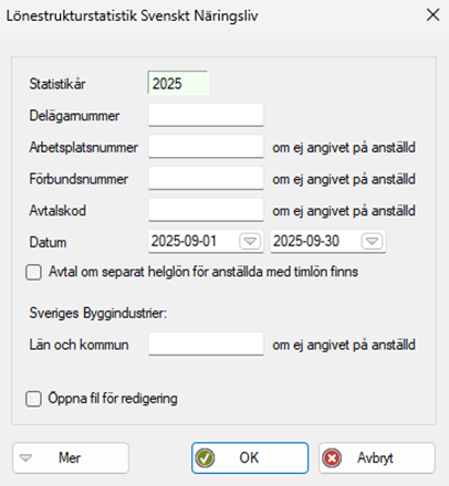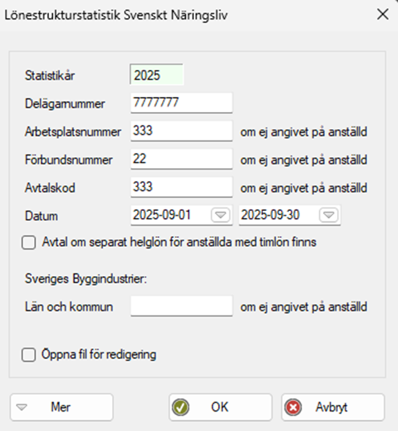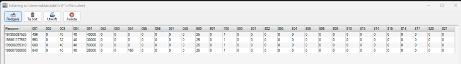 Om du har valt Öppna fil för redigering så kommer detta fönster att öppnas automatiskt efter att filen har sparats. För att redigera en tidigare skapad fil går du via Aktivitet – Lönestatistik – Svenskt Näringsliv, gå via knappen Mer och välj Redigera redan skapad statistikfil – du får då bläddra fram den fil du vill redigera.
