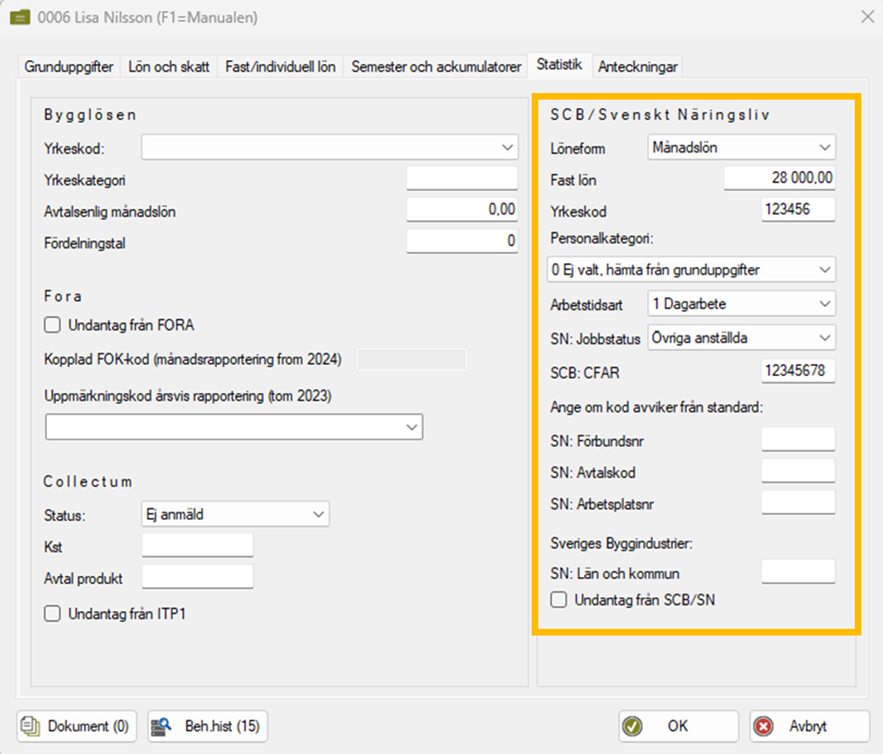 - Se över inställningarna på varje anställd under Uppläggning – Anställda, välj en anställd i taget och gå till fliken Statistik. Där ska Löneform, Fast lön, Yrkeskod, Arbetstidsart, Jobbstatus etc. fyllas i. Observera att Fast lön här inte uppdateras per automatik vid löneförändringar utan du måste manuellt kontrollera att rätt belopp finns angivet innan du tar ut statistikrapporten. Månadslön och Veckolön anges med hela kronor medan Timlön anges med två decimaler. Här kan man även ange om personen ska undantas från statistiken genom att bocka i rutan Undantag från SCB/SN. Det kan gälla t ex praktikanter, utlandsanställda, ägare m fl som inte ska omfattas av statistiken. Statistiken ska annars omfatta alla mellan 18 och 68 år som har arbetat minst en timme med lön under perioden.