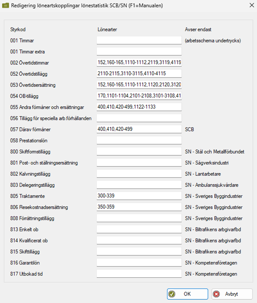 Insamling av timmar och ersättningar sker via så kallade styrkoder och inhämtas i huvudsak från lönearter vilket kräver att det finns en kopplingstabell av lönearter till respektive styrkod. I BLA Lön Plus finns det en standardinställning av kopplingstabellen, men den kan vid behov ändras i respektive företag. Kopplingstabellen kommer man åt via Mer-knappen nere till vänster i huvudfönstret för statistikuttag.
