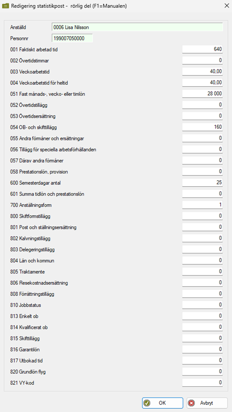 051 – Hämtas från anställdakortet fliken Statistik. Observera! Beloppet anges utan decimaler. Vid timlön skrivs lönen i ören, vid veckolön och månadslön i hela kronor.