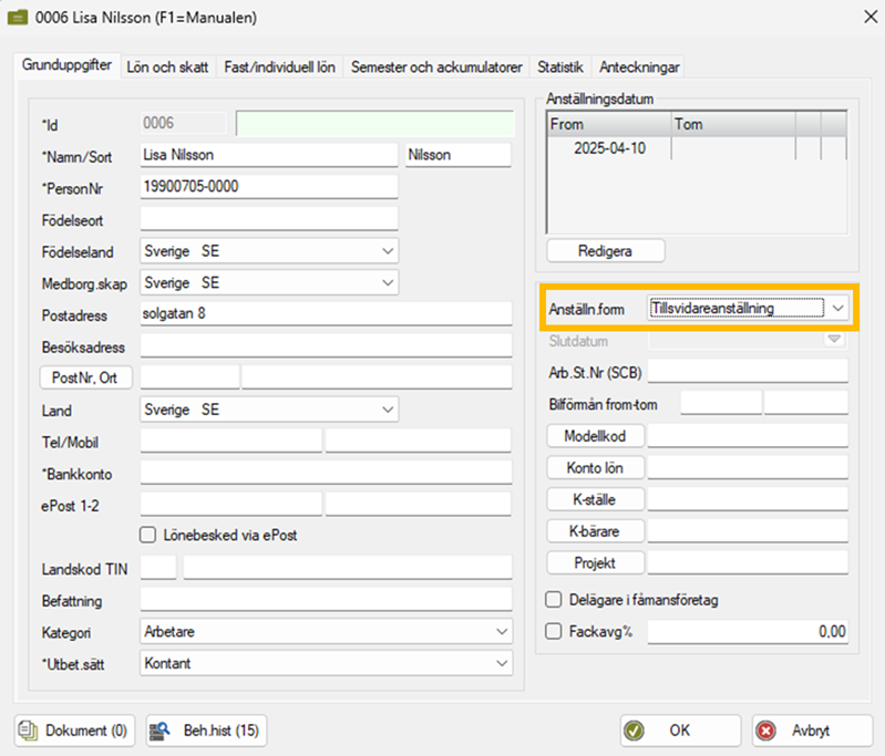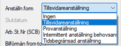 På fliken Grunduppgifter ska även anställningsform anges. I rapporteringen kommer Provanställd och Tillsvidareanställd att markeras som tillsvidareanställning och övriga som tidsbegränsade anställningar.