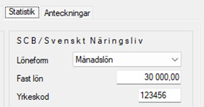 För att statistiken ska kunna tas ut gäller att man på anställdakortet under fliken Statistik lagt in uppgift om löneform, Fast lön (månads- vecko- eller timlön) samt Yrkeskod enligt Svenskt Näringsliv. På fliken Grunduppgifter ska även anställningsform finnas angiven.