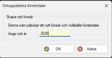 Innan du börjar registrera löner på det nya året behöver du först nollställa lönetotalerna från föregående år. Programmet kommer sedan att automatiskt känna av vilket års skattetabeller som ska användas. Lönernas utbetalningsdatum styr vilket år som gäller.